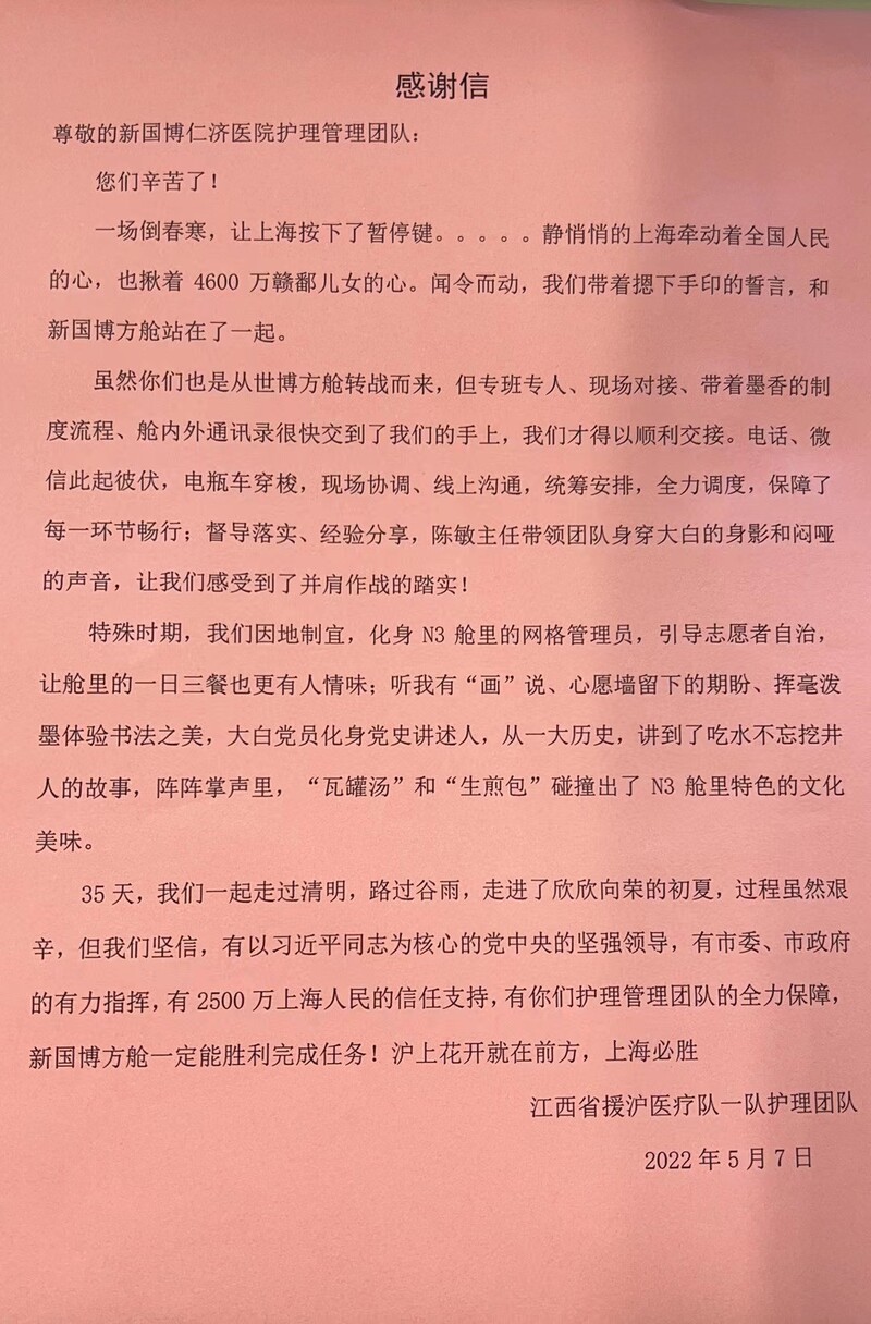 5月7日,收到上級(jí)指示,江西醫(yī)療隊(duì)完成新國(guó)博方艙醫(yī)院支援任務(wù),將繼續(xù)前往支援定點(diǎn)醫(yī)院。江西醫(yī)療隊(duì)領(lǐng)隊(duì)羅禮生與管理團(tuán)隊(duì)向仁濟(jì)醫(yī)院管理組告別,江西醫(yī)療隊(duì)護(hù)理部主任曹英向仁濟(jì)醫(yī)院護(hù)理團(tuán)隊(duì)以及江西醫(yī)療隊(duì)護(hù)理聯(lián)絡(luò)人張占國(guó)表示由衷感謝。