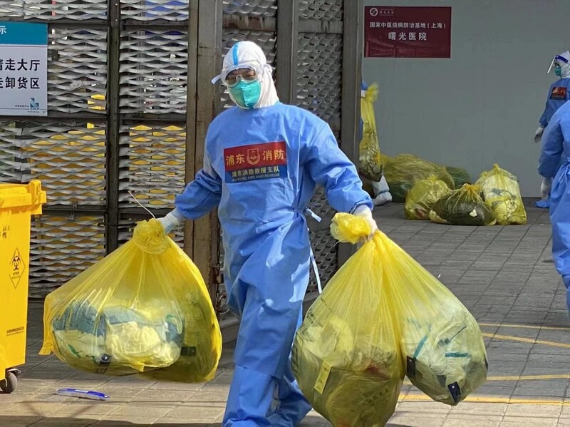 4月10日,新國(guó)博方艙醫(yī)院面臨保潔人員緊缺,堆積的醫(yī)廢垃圾急需轉(zhuǎn)運(yùn),排除消防隱患,陸家嘴消防大隊(duì)大隊(duì)長(zhǎng)李和清向仁濟(jì)醫(yī)院新國(guó)博方艙醫(yī)院副院長(zhǎng)陳尉華主動(dòng)提出請(qǐng)戰(zhàn),將N1艙與N2艙以及卸貨區(qū)的醫(yī)廢垃圾集中轉(zhuǎn)運(yùn)至戶外臨時(shí)堆放點(diǎn)!爱(dāng)時(shí)消防員真是幫我們解決了大問(wèn)題!”陳尉華說(shuō)。