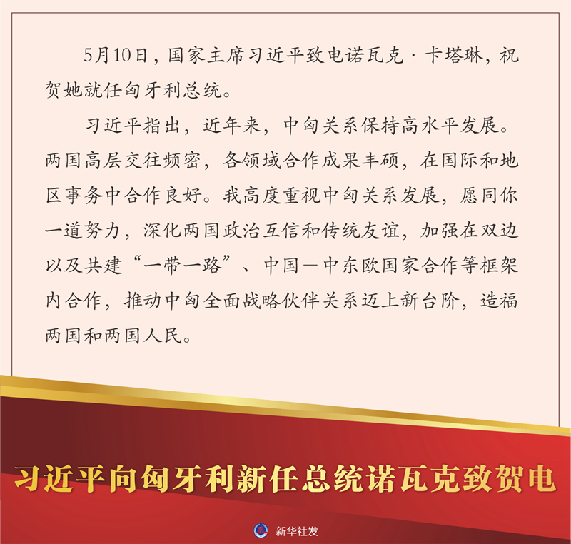 5月10日,國(guó)家主席習(xí)近平致電諾瓦克·卡塔琳,祝賀她就任匈牙利總統(tǒng)。