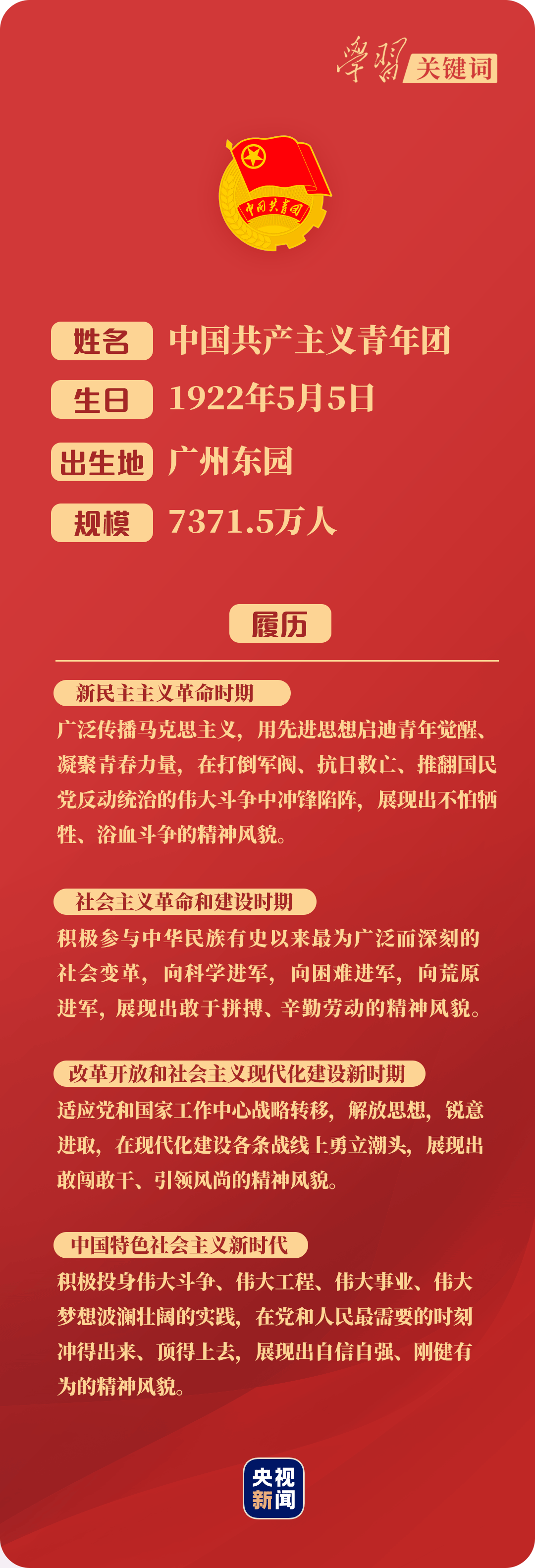 “今天,我們在這里隆重集會,慶祝中國共產主義青年團成立100周年,就是要激勵廣大團員青年在實現(xiàn)中華民族偉大復興中國夢的新征程上奮勇前進!睉c祝大會上,習近平總書記開宗明義。