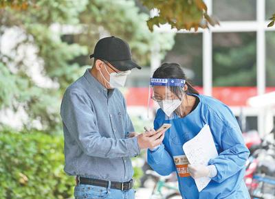 北京市朝陽區(qū)建外街道北郎社區(qū)一處核酸檢測點(diǎn),志愿者邊萌(右)在協(xié)助一名檢測者掃碼登記。 新華社記者 鞠煥宗攝