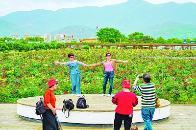游客在溫州市蒼南縣馬站鎮(zhèn)中魁村花海里賞花、拍照。