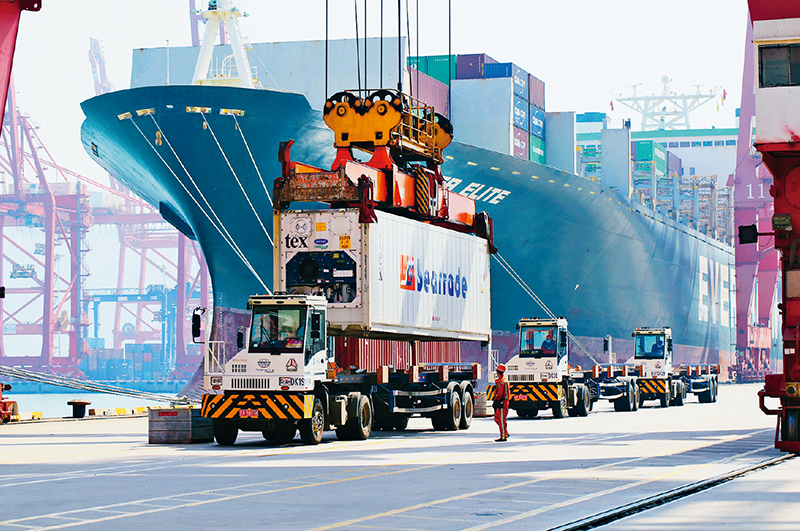 社會主義是干出來的,新時代是奮斗出來的!拔逡弧奔倨,許多勞動者堅守崗位,在辛勤工作中度過勞動者的節(jié)日。圖為2022年5月3日,在江蘇省連云港港集裝箱碼頭,工作人員為到港貨船卸運集裝箱。 新華社發(fā) 王健民/攝