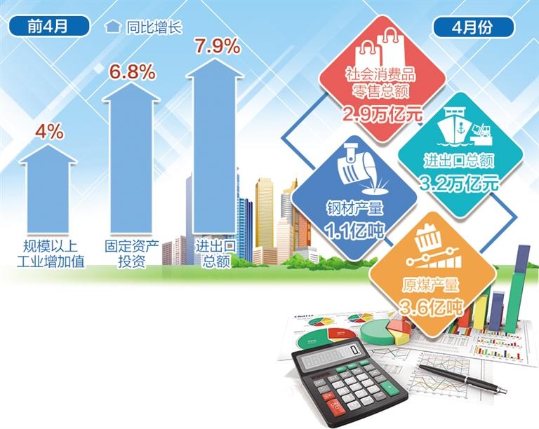4月份,社會消費品零售總額達2.9萬億元,進出口總額達3.2萬億元。從累計看,全國主要指標仍保持增長。前4月規(guī)模以上工業(yè)增加值同比增長4%,固定資產投資和進出口總額分別增長6.8%和7.9%。