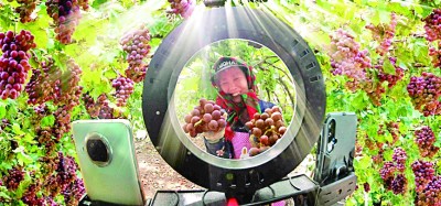 河南省信陽市平橋區(qū)五里鎮(zhèn)九店村葡萄采摘園里,村民正在進(jìn)行銷售直播。劉世興攝/光明圖片