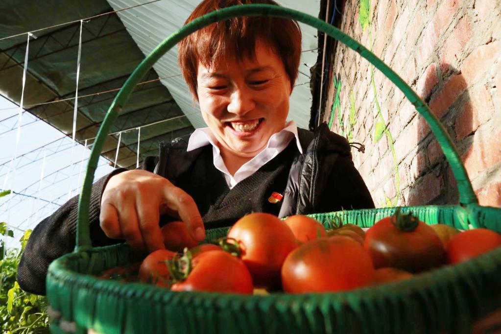 齊曉景在自家大棚中采摘蔬菜。(科爾沁右翼前旗委宣傳部供圖)