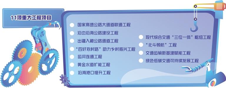 重大工程項(xiàng)目包涉及國(guó)家高速公路大通道聯(lián)通工程、沿邊沿海公路建設(shè)工程、出疆入藏公路通道工程、“四好農(nóng)村路”助力鄉(xiāng)村振興工程、運(yùn)河連通工程、黃金水道擴(kuò)能工程、沿海港口提升工程、現(xiàn)代綜合交通“三位一體”樞紐工程、“北斗領(lǐng)航”工程、交通運(yùn)輸新基建賦能工程、綠色低碳交通可持續(xù)發(fā)展工程11項(xiàng)。