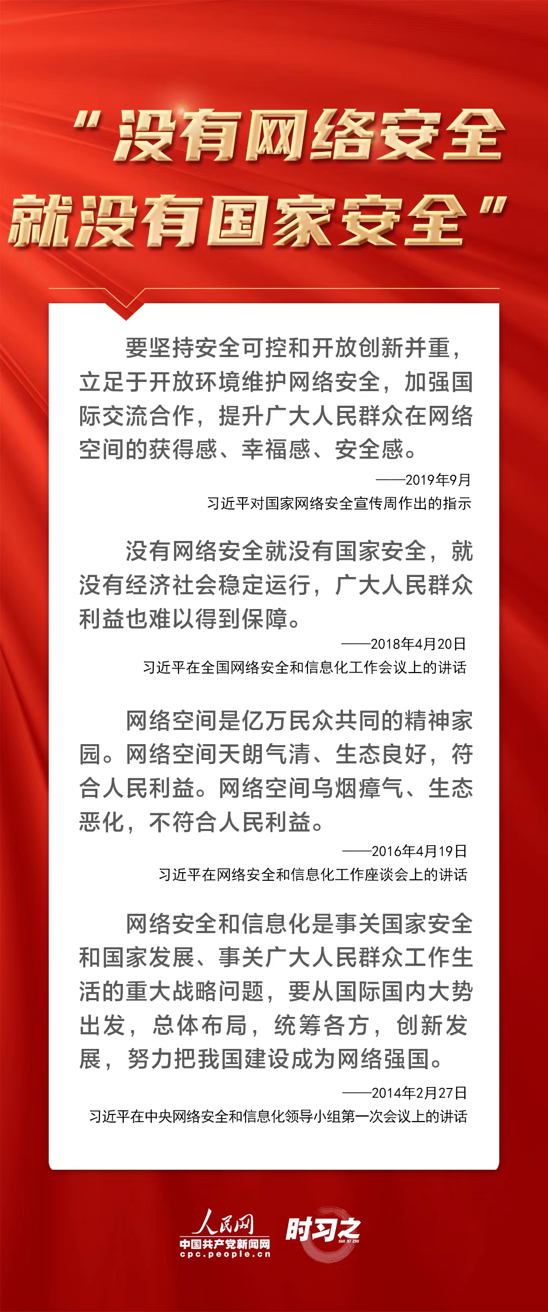 沒(méi)有網(wǎng)絡(luò)安全就沒(méi)有國(guó)家安全。今年是《中華人民共和國(guó)網(wǎng)絡(luò)安全法》施行五周年。一直以來(lái),習(xí)近平總書(shū)記高度重視網(wǎng)絡(luò)安全和信息化工作,敏銳把握信息時(shí)代“時(shí)”與“勢(shì)”,多次在不同場(chǎng)合就網(wǎng)絡(luò)安全發(fā)表一系列重要論述,為維護(hù)國(guó)家網(wǎng)絡(luò)安全,筑牢國(guó)家網(wǎng)絡(luò)安全屏障奠定基石。
