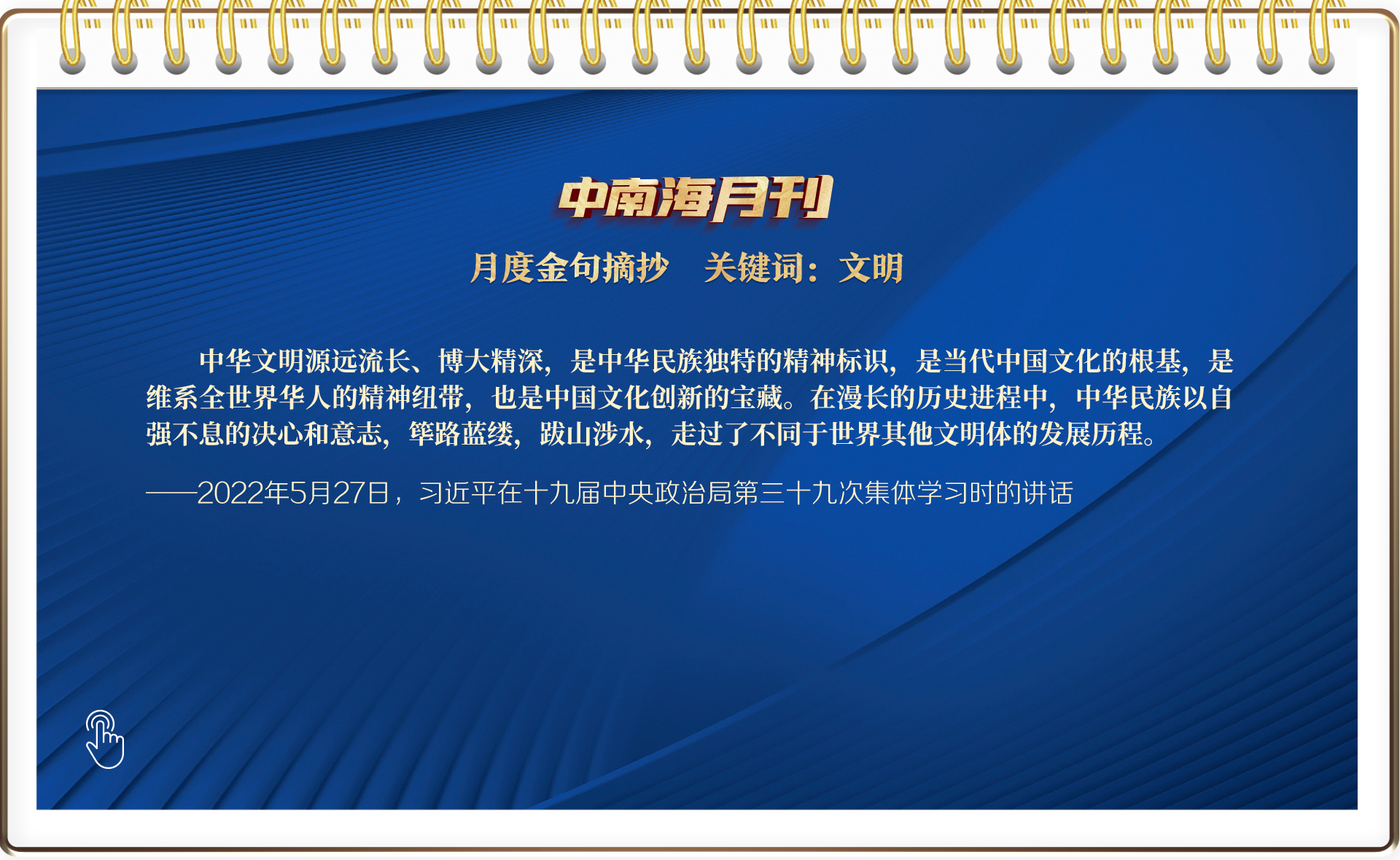 5月27日,中共中央政治局就深化中華文明探源工程進(jìn)行第三十九次集體學(xué)習(xí)。習(xí)近平總書(shū)記在主持學(xué)習(xí)時(shí)強(qiáng)調(diào),要堅(jiān)持守正創(chuàng)新,推動(dòng)中華優(yōu)秀傳統(tǒng)文化同社會(huì)主義社會(huì)相適應(yīng),展示中華民族的獨(dú)特精神標(biāo)識(shí),更好構(gòu)筑中國(guó)精神、中國(guó)價(jià)值、中國(guó)力量。