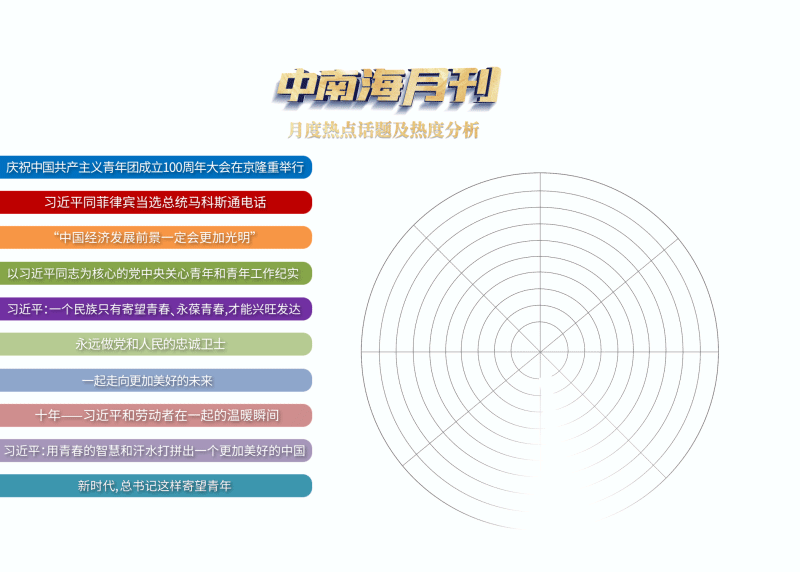 央視網(wǎng)“智聞”系統(tǒng)提取分析了2022年5月全網(wǎng)時(shí)政新聞熱點(diǎn),慶祝中國(guó)共產(chǎn)主義青年團(tuán)成立100周年大會(huì)備受網(wǎng)友關(guān)注,與之關(guān)聯(lián)的“以習(xí)近平同志為核心的黨中央關(guān)心青年和青年工作紀(jì)實(shí)”“用青春的智慧和汗水打拼出一個(gè)更加美好的中國(guó)”“新時(shí)代,總書(shū)記這樣寄望青年”等話題熱度很高。