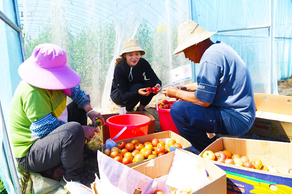 中國(guó)農(nóng)業(yè)大學(xué)學(xué)生吳林靜和西槐莊村村民正在收獲番茄。黨維婷攝