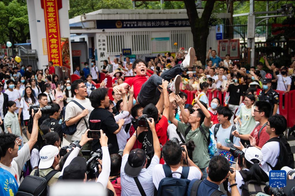 6月9日,在湖南省長沙市一中考點外,學(xué)生拋起老師慶祝高考結(jié)束。