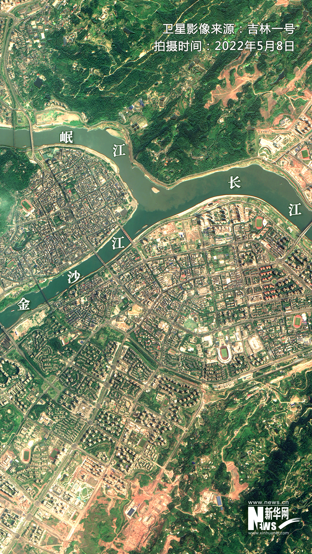 ▲衛(wèi)星視角下的宜賓三江口。衛(wèi)星影像來(lái)源:吉林一號(hào)