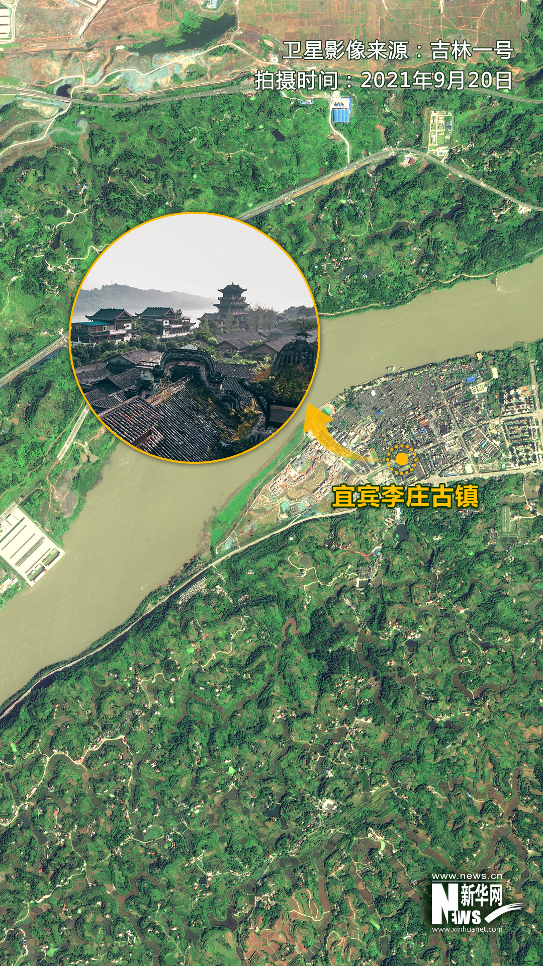 ▲衛(wèi)星視角下的宜賓李莊古鎮(zhèn)。衛(wèi)星影像來(lái)源:吉林一號(hào)