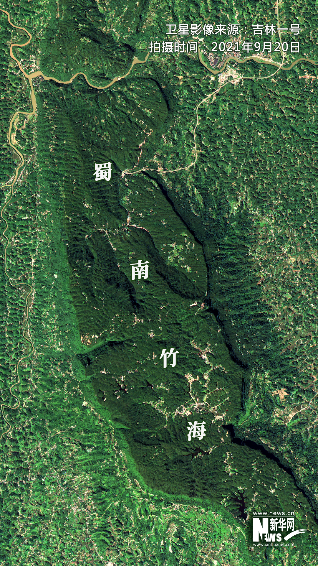 ▲衛(wèi)星視角下的蜀南竹海。衛(wèi)星影像來(lái)源:吉林一號(hào)