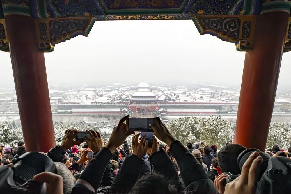 人們?cè)诒本┚吧焦珗@的萬春亭拍攝雪后的故宮(2019年11月30日攝)。新華社記者 沈伯韓 攝