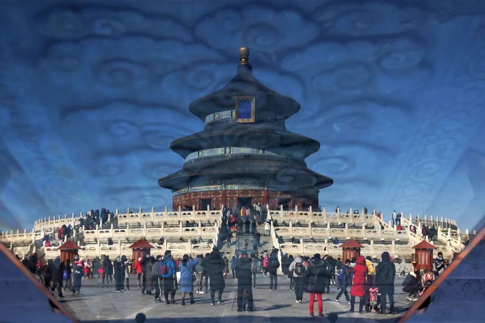 這是2021年2月17日通過玻璃反光拍攝的游客在天壇公園參觀游覽(照片旋轉(zhuǎn)180度)。新華社記者 鞠煥宗 攝