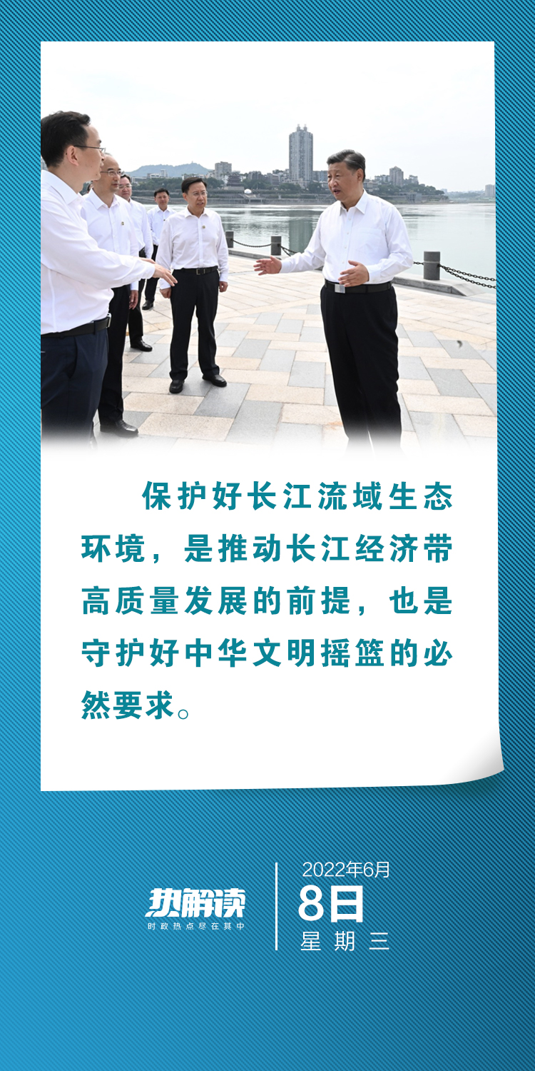6月8日,習(xí)近平總書(shū)記來(lái)到宜賓三江口長(zhǎng)江公園,駐足江岸,眺望三江交匯處。前方,岷江與金沙江波濤翻滾、涇渭分明?倳(shū)記在這里聽(tīng)取了當(dāng)?shù)赝七M(jìn)長(zhǎng)江流域生態(tài)修復(fù)保護(hù)、實(shí)施長(zhǎng)江水域禁捕退捕等情況介紹,并指出,保護(hù)好長(zhǎng)江流域生態(tài)環(huán)境,是推動(dòng)長(zhǎng)江經(jīng)濟(jì)帶高質(zhì)量發(fā)展的前提,也是守護(hù)好中華文明搖籃的必然要求。