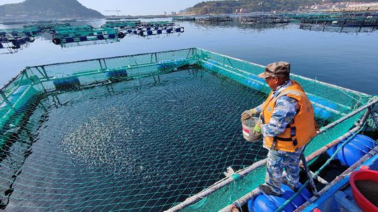 山東長(zhǎng)島南隍城村漁民王茂義正在給他養(yǎng)殖的黑鲪魚(yú)喂食。 顧玉雪攝