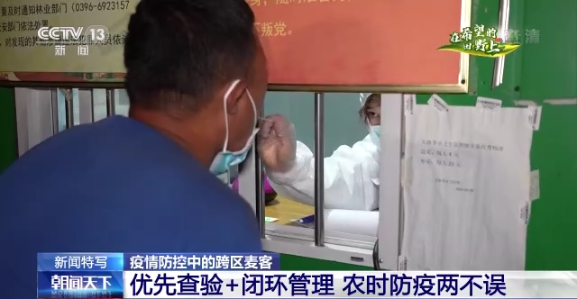 晚上10點(diǎn)多,來(lái)自黑龍江佳木斯的機(jī)手孔德寶和老鄉(xiāng)田佰良,在完成信陽(yáng)息縣的收割后,拉著兩臺(tái)收割機(jī)趕到了上蔡縣,要按一位用戶發(fā)來(lái)的定位去往麥?zhǔn)盏攸c(diǎn)。駐馬店上蔡縣是河南的種糧大縣,小麥種植面積146萬(wàn)畝。6月1日前后,上蔡縣的小麥進(jìn)入大面積的收割時(shí)段,3000多臺(tái)跨區(qū)作業(yè)的收割機(jī)云集上蔡參加搶收。持有跨區(qū)作業(yè)證的孔德寶和老鄉(xiāng)田佰良,在農(nóng)機(jī)轉(zhuǎn)運(yùn)綠色通道服務(wù)站點(diǎn),接受免費(fèi)落地核酸檢測(cè)。