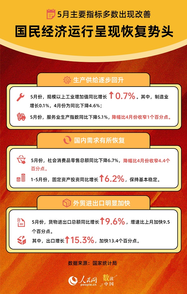 生產(chǎn)供給逐步回升,國內(nèi)需求有所恢復(fù),外貿(mào)進出口明顯加快……15日,國家統(tǒng)計局公布多項數(shù)據(jù)表明,5月份主要指標多數(shù)出現(xiàn)改善,國民經(jīng)濟運行呈現(xiàn)恢復(fù)勢頭。
