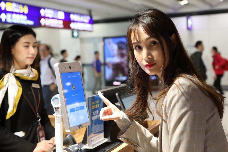 2019年4月1日,一名女士(右)在香港國際機場試驗支付寶“刷臉支付”。新華社記者 吳曉初 攝