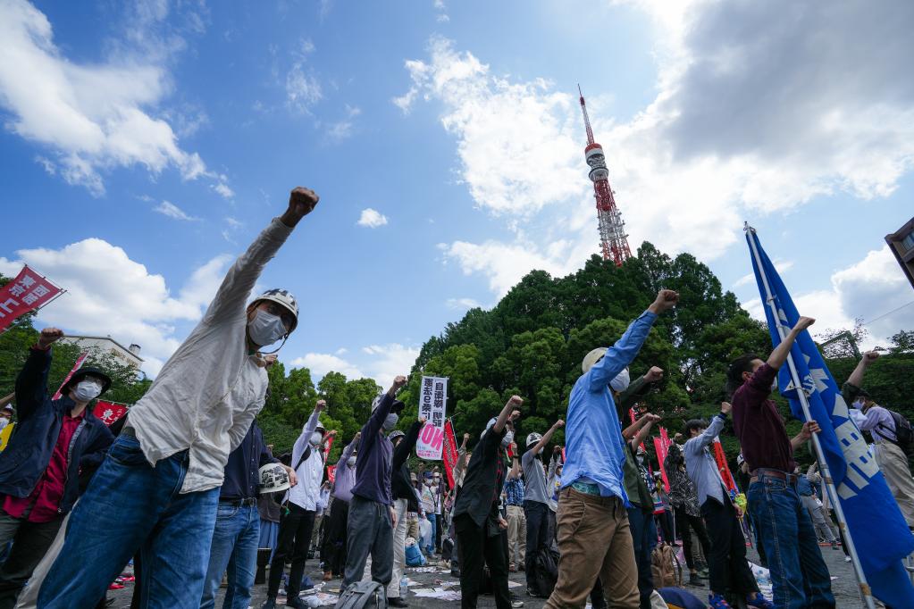 5月22日,民眾在日本東京舉行抗議集會(huì)。來自日本各地的數(shù)百名民眾在東京舉行集會(huì)和示威游行,抗議美國總統(tǒng)拜登當(dāng)天開始的訪日之行,抵制日美首腦會(huì)晤和美日印澳“四邊機(jī)制”峰會(huì)。(新華社記者張笑宇攝)
