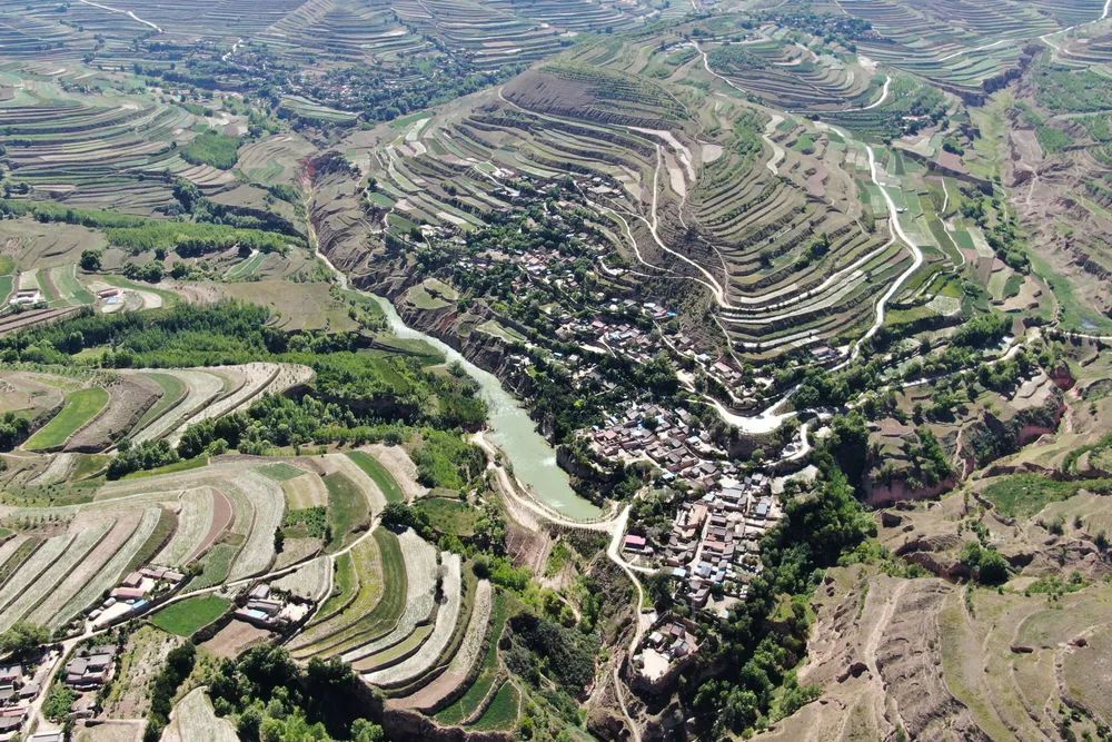 這是6月15日在甘肅省定西市通渭縣榜羅鎮(zhèn)拍攝的張川村許堡社風(fēng)景(無人機(jī)照片)。新華社記者 馬希平 攝