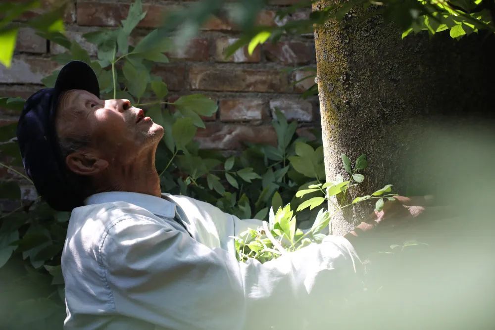 6月15日,在甘肅省定西市通渭縣榜羅鎮(zhèn)張川村許堡社,許志剛查看1968年自己種的第一棵樹的生長情況。新華社記者 馬希平 攝