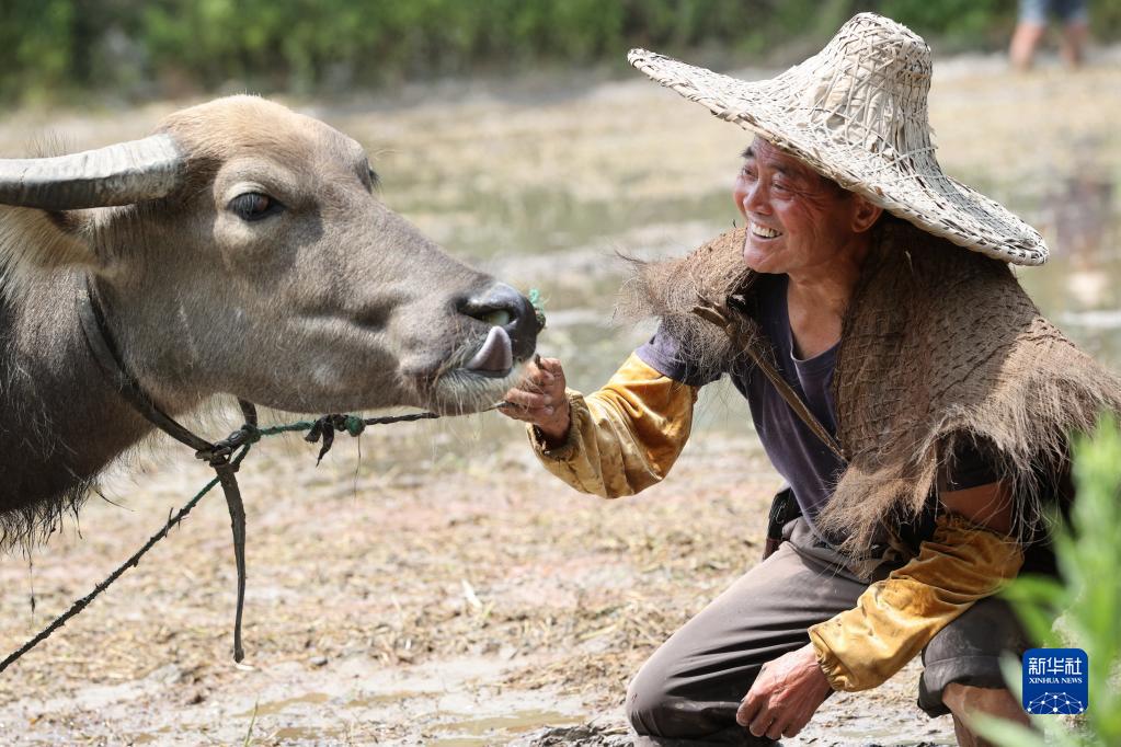 6月17日,在浙江省湖州市德清縣莫干山鎮(zhèn)筏頭村,農(nóng)戶沈水根注視著他的耕!岸W印薄I蛩16歲開始養(yǎng)牛耕田,“二牛子”已陪伴主人耕作3年多。