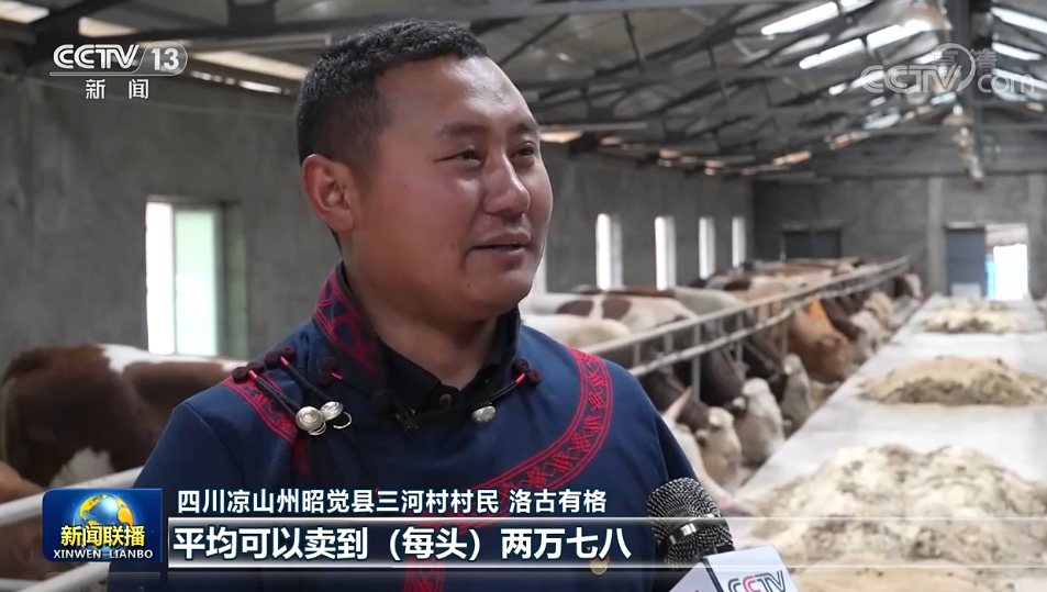 四川涼山州昭覺縣三河村村民 洛古有格:當時總書記來的時候,我們這個養(yǎng)牛只有十幾頭。通過發(fā)展,我們?nèi)哟逵辛?000多頭這個西門塔爾牛,F(xiàn)在我們這個牛,平均可以賣到(每頭)兩萬七八,大的可以賣到三萬多元,效益特別好。