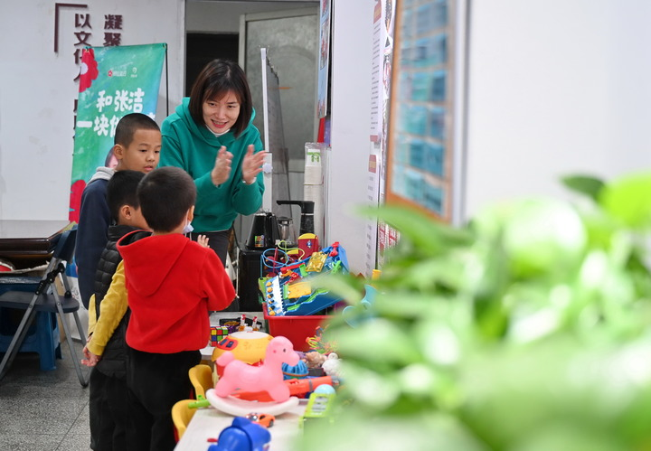 2021年12月4日,張潔(右一)在“村童媽媽聚樂(lè)部”教小朋友演唱歌曲《愛(ài)的鼓勵(lì)》。 新華社記者 林善傳 攝
