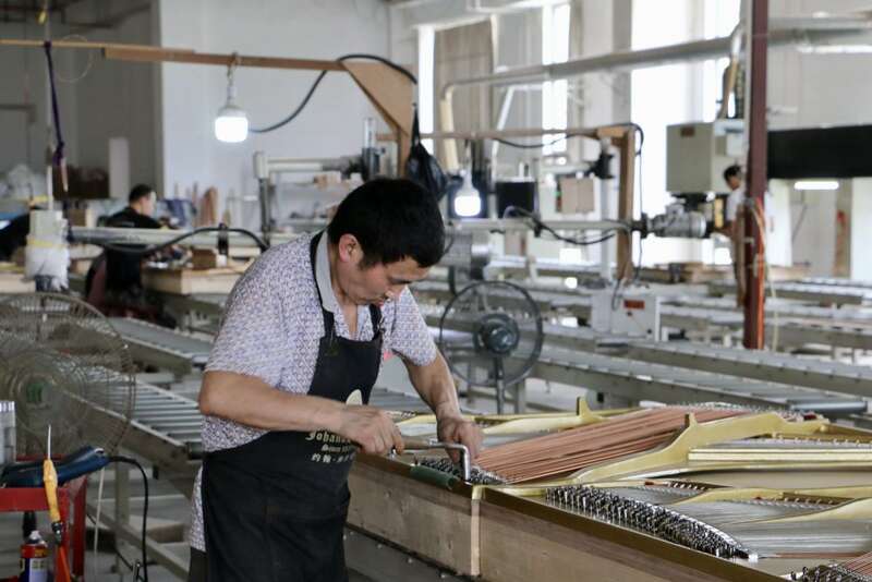 6月21日,東衡村鋼琴眾創(chuàng)園的工人在為鋼琴掛弦。新華社記者 王聿昊 攝