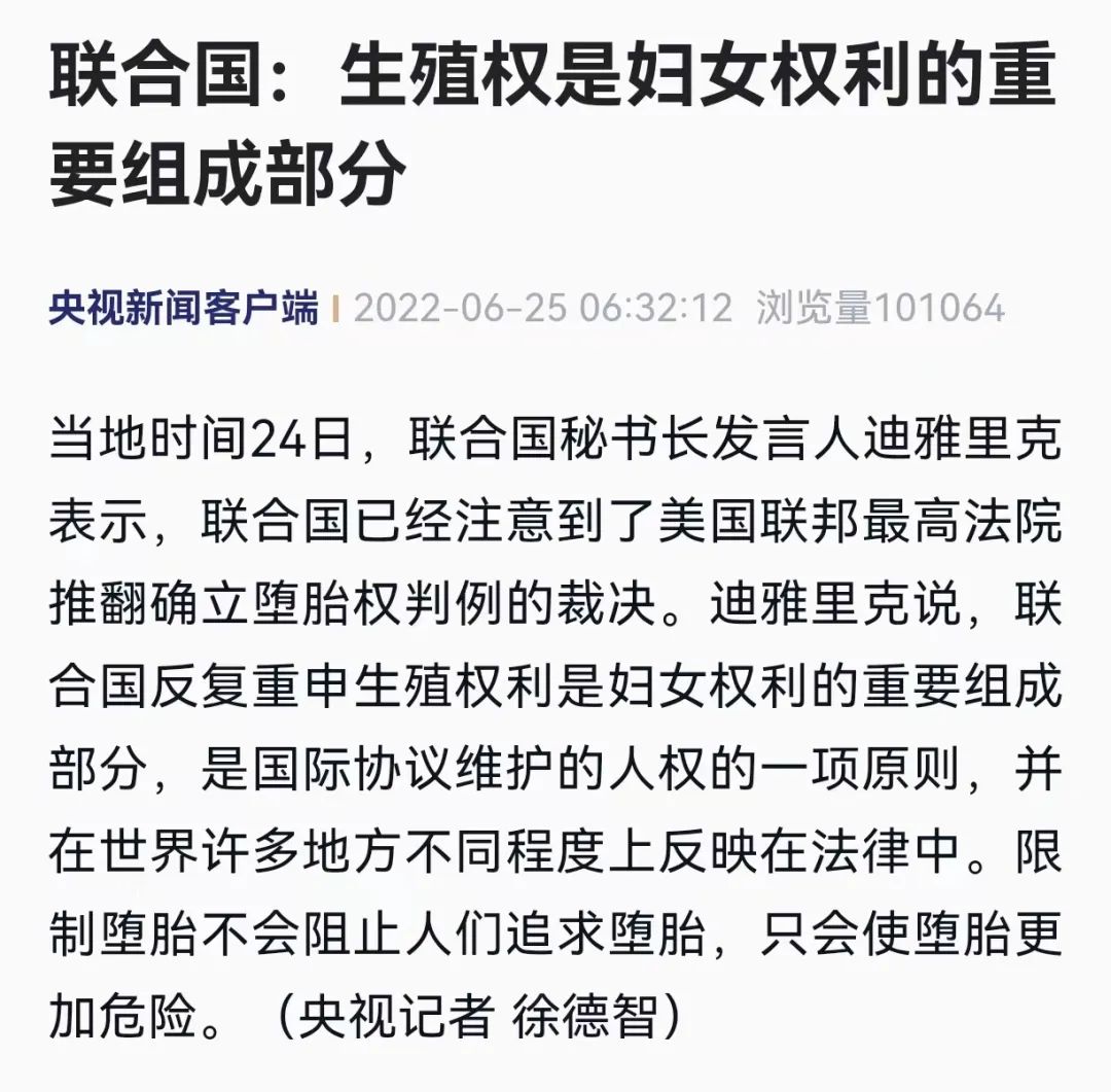 當(dāng)?shù)貢r(shí)間24日,聯(lián)合國秘書長發(fā)言人迪雅里克表示,聯(lián)合國已經(jīng)注意到了美國聯(lián)邦最高法院推翻確立墮胎權(quán)判例的裁決。迪雅里克說,聯(lián)合國反復(fù)重申生殖權(quán)利是婦女權(quán)利的重要組成部分,是國際協(xié)議維護(hù)的人權(quán)的一項(xiàng)原則,并在世界許多地方不同程度上反映在法律中。限制墮胎不會阻止人們追求墮胎,只會使墮胎更加危險(xiǎn)。
