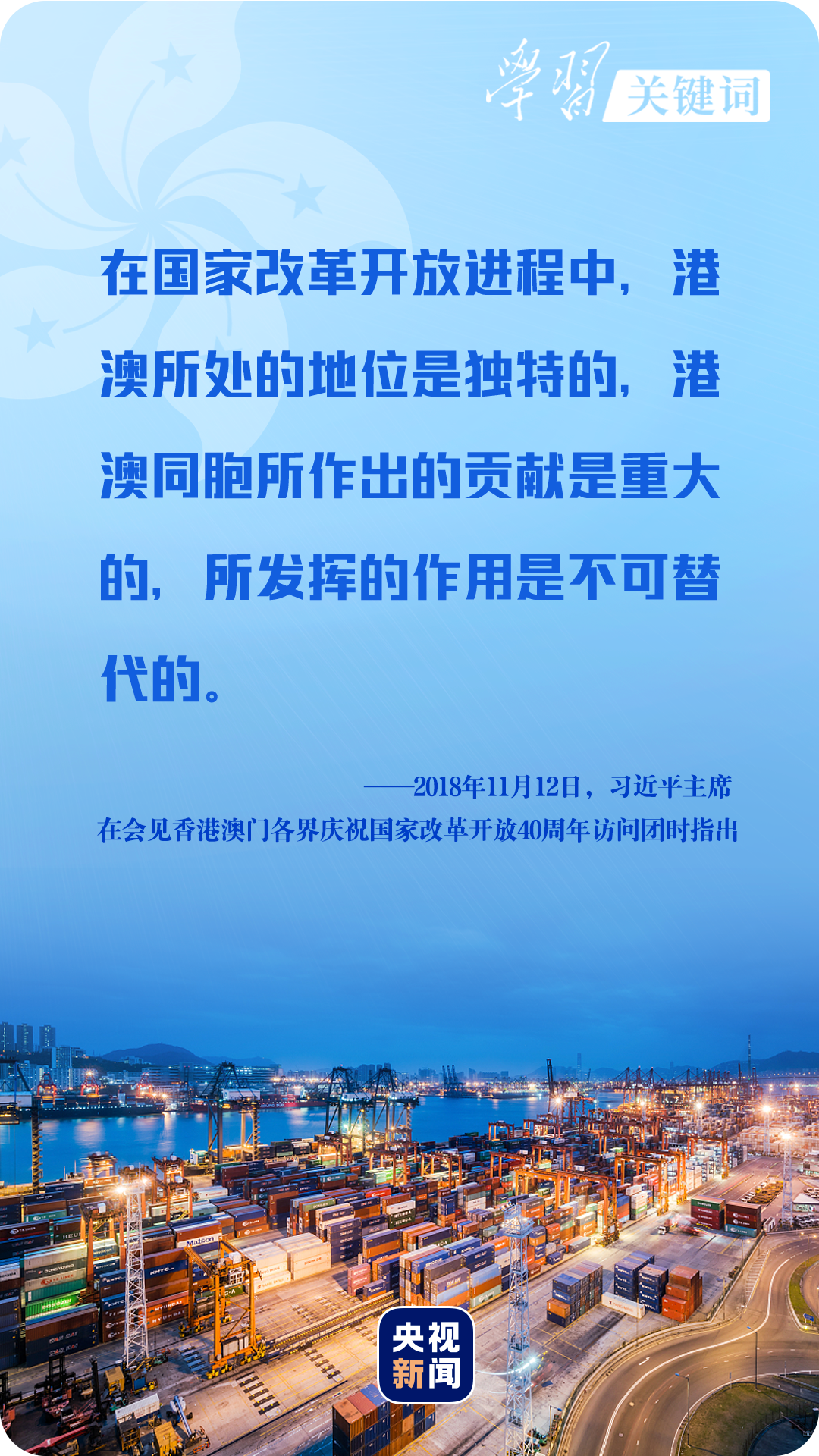“香港背靠祖國(guó)、面向世界,有著許多有利發(fā)展條件和獨(dú)特競(jìng)爭(zhēng)優(yōu)勢(shì)。特別是這些年國(guó)家的持續(xù)快速發(fā)展為香港發(fā)展提供了難得機(jī)遇、不竭動(dòng)力、廣闊空間!2017年7月1日,習(xí)近平主席在慶祝香港回歸祖國(guó)二十周年大會(huì)暨香港特別行政區(qū)第五屆政府就職典禮上堅(jiān)定地說(shuō)。