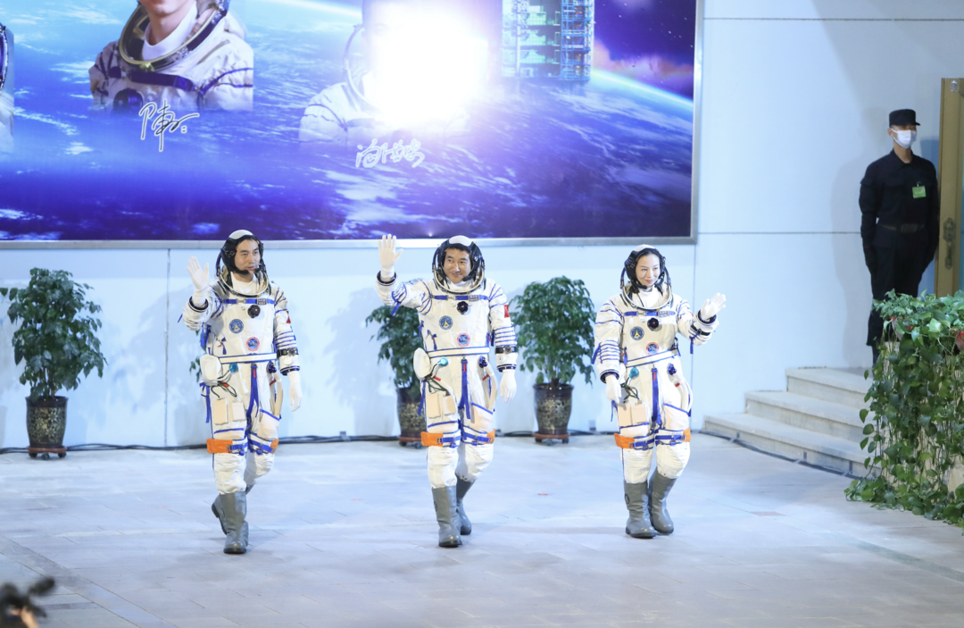 2021年10月15日21時40分,神舟十三號載人飛行任務航天員乘組出征儀式,在酒泉衛(wèi)星發(fā)射中心問天閣廣場舉行,翟志剛、王亞平、葉光富3名航天員領命出征。