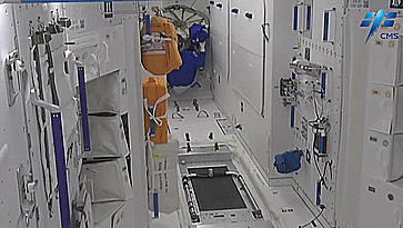2021年10月17日9時50分,神舟十三號航天員乘組成功開啟貨物艙艙門,順利進入天舟三號貨運飛船,進行物資轉運等相關工作。