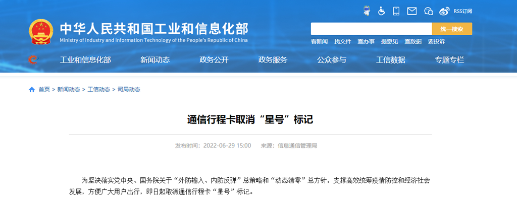 為堅決落實黨中央、國務院關于“外防輸入、內(nèi)防反彈”總策略和“動態(tài)清零”總方針,支撐高效統(tǒng)籌疫情防控和經(jīng)濟社會發(fā)展,方便廣大用戶出行,即日起取消通信行程卡“星號”標記。