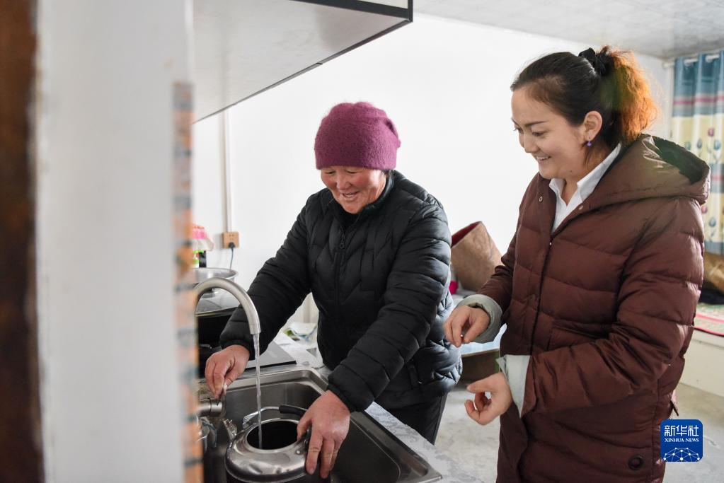 在新疆福?h解特阿熱勒鎮(zhèn)京什開薩爾村,村干部(右)來到前不久剛接通自來水的村民家中了解水質(zhì)情況(2021年11月25日攝)。新華社記者 丁磊 攝