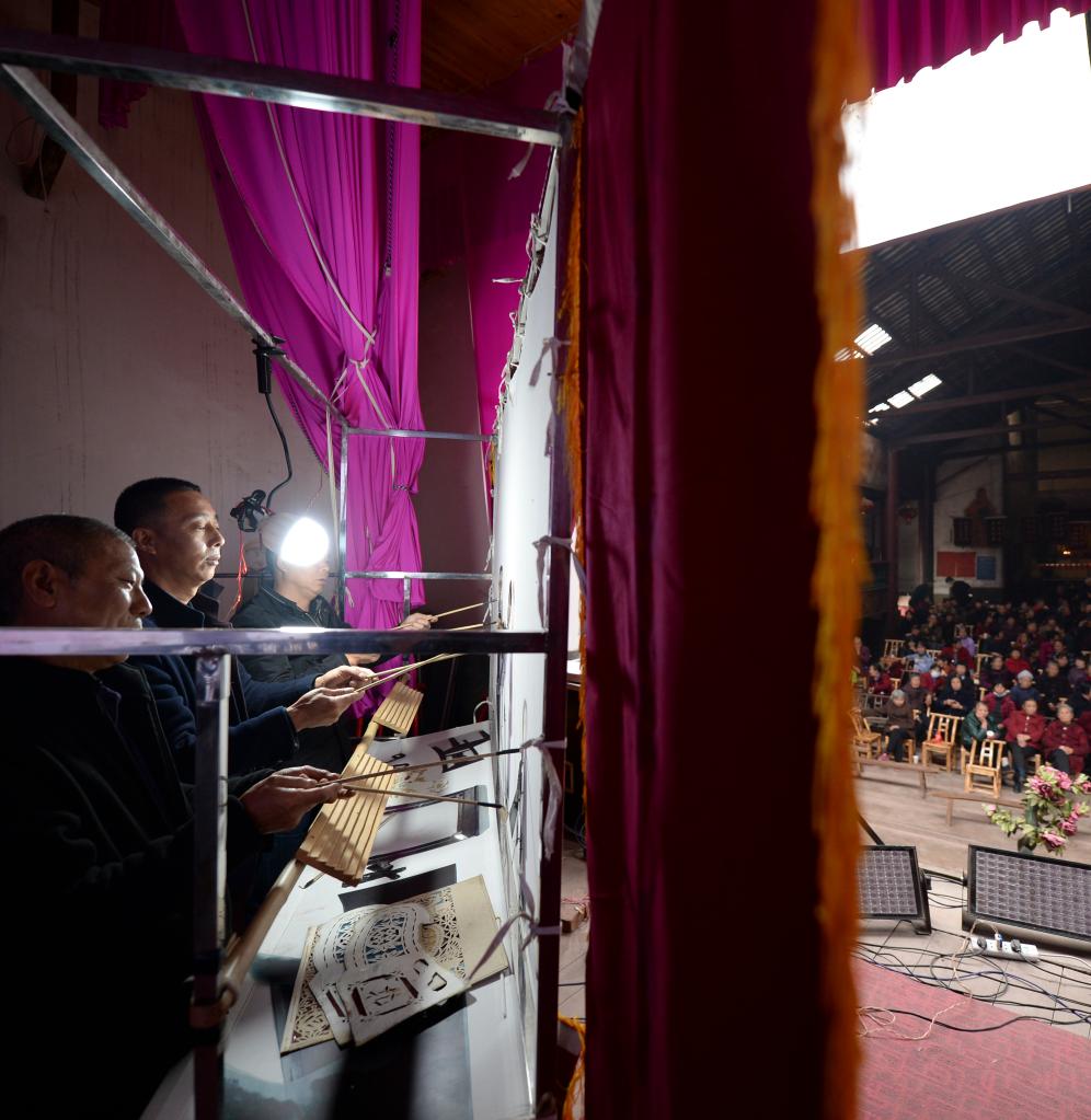 在湖南省瀏陽(yáng)市沙市鎮(zhèn)秧田村,宋偉軍(左二)和劇團(tuán)成員表演皮影戲(2021年11月16日攝)。新華社記者 陳振海 攝