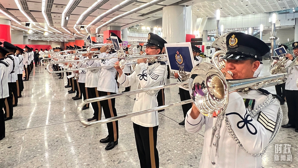 當(dāng)天,香港西九龍站內(nèi),紅色的地毯、鮮艷的旗幟、涌動的花束,表達著香港市民的熱忱。歡迎儀式上,由80人組成的香港警察樂隊奏響歡迎曲。這是一支有著70多年歷史的“元老”樂隊。因為他們使用的樂器都是銀色,所以又被稱為“銀樂隊”。