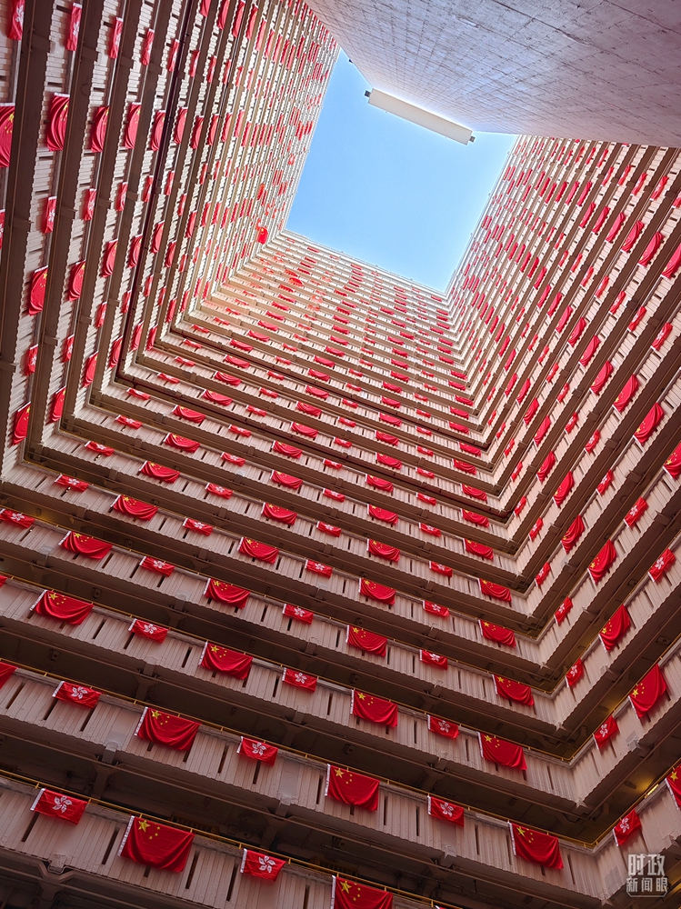香港坪石邨金石樓,每層欄桿都掛上了國旗和區(qū)旗。(總臺央視記者楊光拍攝)