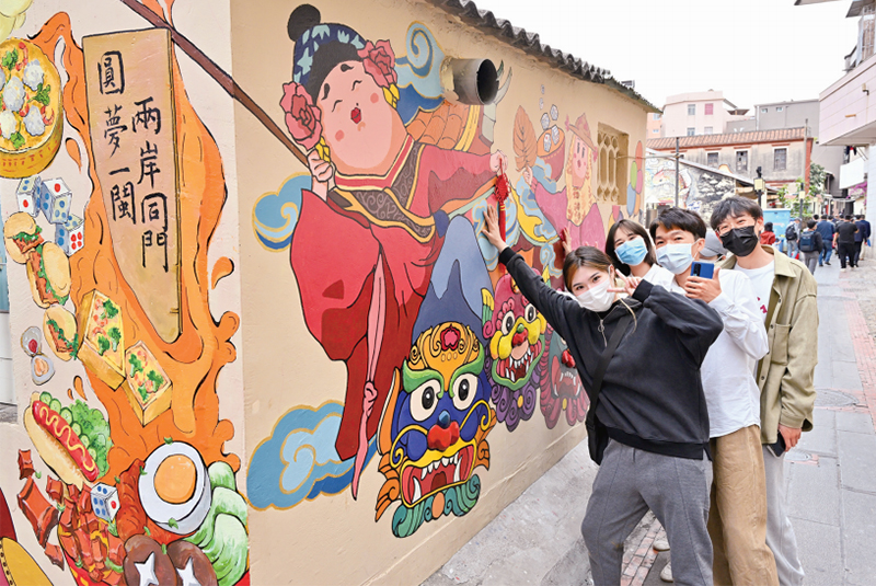 2021年12月10日,以“融通兩岸 共繪家園”為主題的2021海峽論壇第三屆創(chuàng)意涂鴉大獎賽在廈門市集美區(qū)大社文創(chuàng)旅游街區(qū)成功落幕。圖為二等獎畫作《圓夢一閩 兩岸同門》的創(chuàng)作者們與涂鴉作品合影。 新華社記者 姜克紅/攝