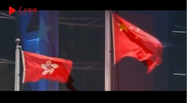 五星紅旗和紫荊花區(qū)旗飄揚(yáng)在碧海藍(lán)天之間