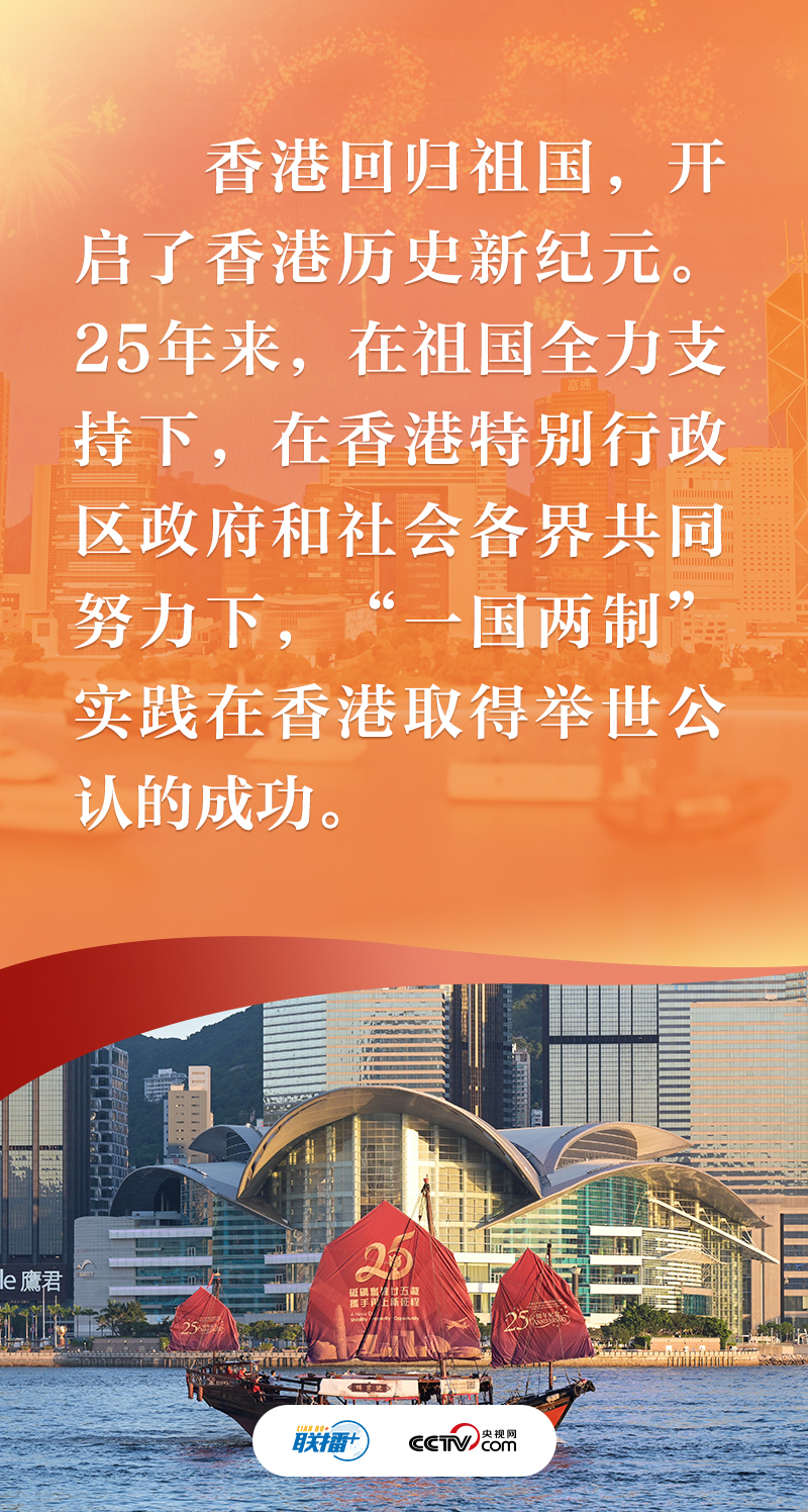 7月1日,習(xí)近平主席在慶祝香港回歸祖國25周年大會(huì)暨香港特別行政區(qū)第六屆政府就職典禮上發(fā)表重要講話,深情回顧香港同胞同祖國風(fēng)雨同舟、血脈相連的奮斗史,高度評(píng)價(jià)“一國兩制”實(shí)踐在香港取得的舉世公認(rèn)的成功經(jīng)驗(yàn),并對(duì)新一屆特別行政區(qū)政府提出殷切厚望。