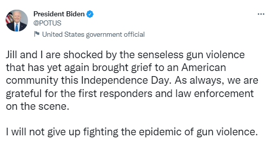 據(jù)美國哥倫比亞廣播公司(CBS News)報道,當(dāng)?shù)貢r間7月4日,美國伊利諾伊州海蘭帕克市的“獨立日”游行中發(fā)生槍擊事件,已至少6人死亡、超過20人受傷。拜登當(dāng)天在推文中寫道:“‘獨立日’發(fā)生的毫無意義的槍擊暴力事件再次給美國社區(qū)帶來悲痛,吉爾(拜登夫人)和我對此感到震驚!