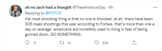 伊利諾伊州州長普利茲克(Pritzker)就此事發(fā)表講話稱“沒有言語”可以形容那些遇難者和受傷者的親屬在這一天所遭遇的損失和悲傷。普利茲克表示:“在公開慶!毩⑷铡瘯r,(槍手)藏在屋頂上,用突擊步槍射殺無辜的人,這種邪惡沒有言語可以形容。我也無法說出任何言語來減輕那些家庭的痛苦,他們的 7月4日不是‘慶!,而是‘悲傷’。”根據(jù)非營利組織的數(shù)據(jù),此次槍擊已是美國今年發(fā)生的第308起大規(guī)模槍擊事件。美媒稱,“獨立日”的這起大規(guī)模槍擊事件讓美國本已血腥的春季和夏季“更加血腥”。
