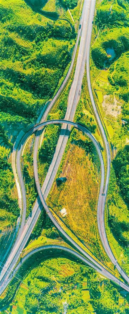 俯瞰太行山高速和滄榆高速在阜平境內(nèi)互通交匯處。便捷的交通網(wǎng)絡(luò)促進了阜平經(jīng)濟快速發(fā)展。
