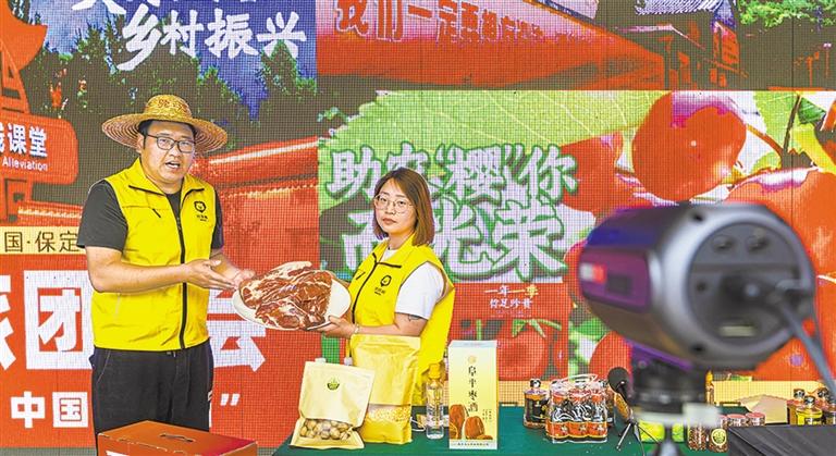 阜平縣駱駝灣村“農(nóng)旅團購會”直播團隊,在為當(dāng)?shù)剞r(nóng)副產(chǎn)品直播帶貨。