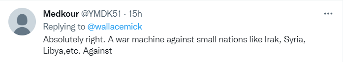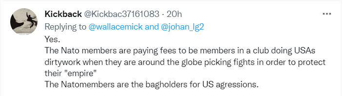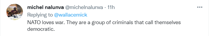 10日,華萊士以同樣的視頻配上不同的文字發(fā)了兩條推文,配文是他在視頻中講話的節(jié)選!氨奔s不是一個防御聯(lián)盟,而是一臺戰(zhàn)爭機器,”華萊士說,“去問問阿富汗、伊拉克和利比亞人民就知道了。北約的真正目的是捍衛(wèi)正在衰落的美國霸權(quán)以及一個單極世界體系,北約為此而存在。”